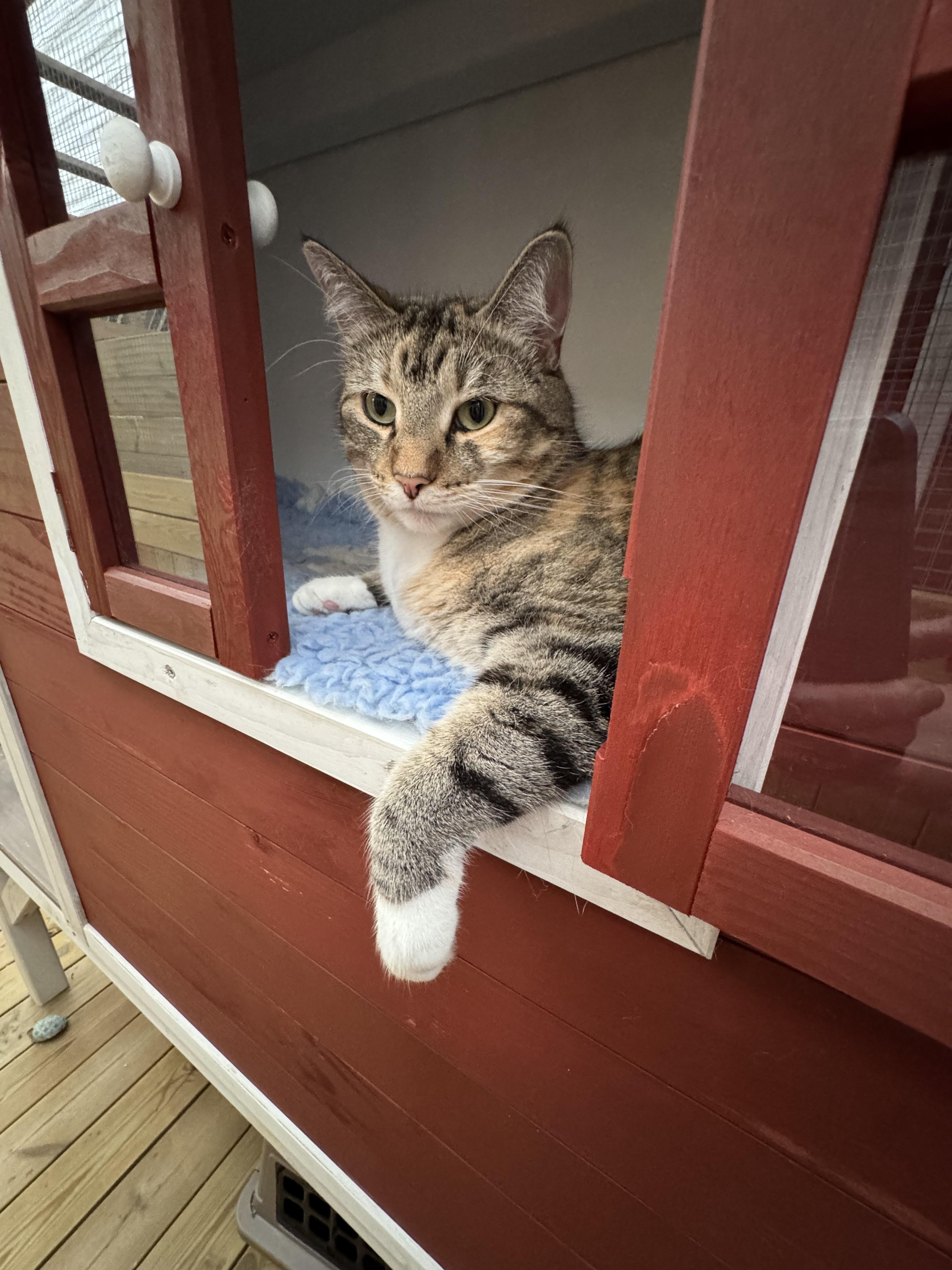 ombonat två-våningshus. På varje våning finns fönster och mjuka fällar samt Igloobäddar. Huset har två egna mindre in/utgångar som katterna använder, det finns även en vanlig dörr på huset som används vid städning mm. Katterna äter och dricker samt går på lådan på bottenvåningen inne i huset.