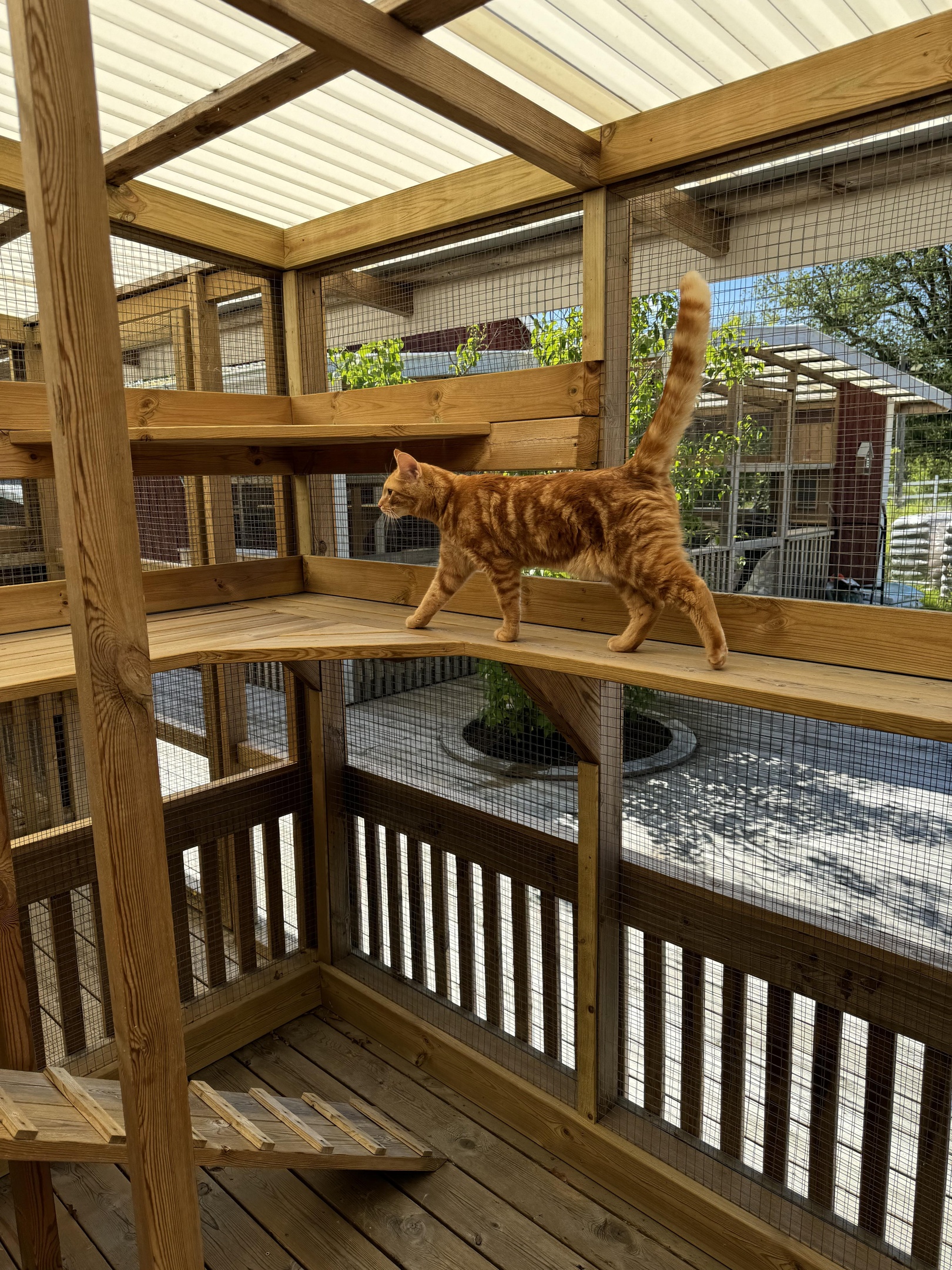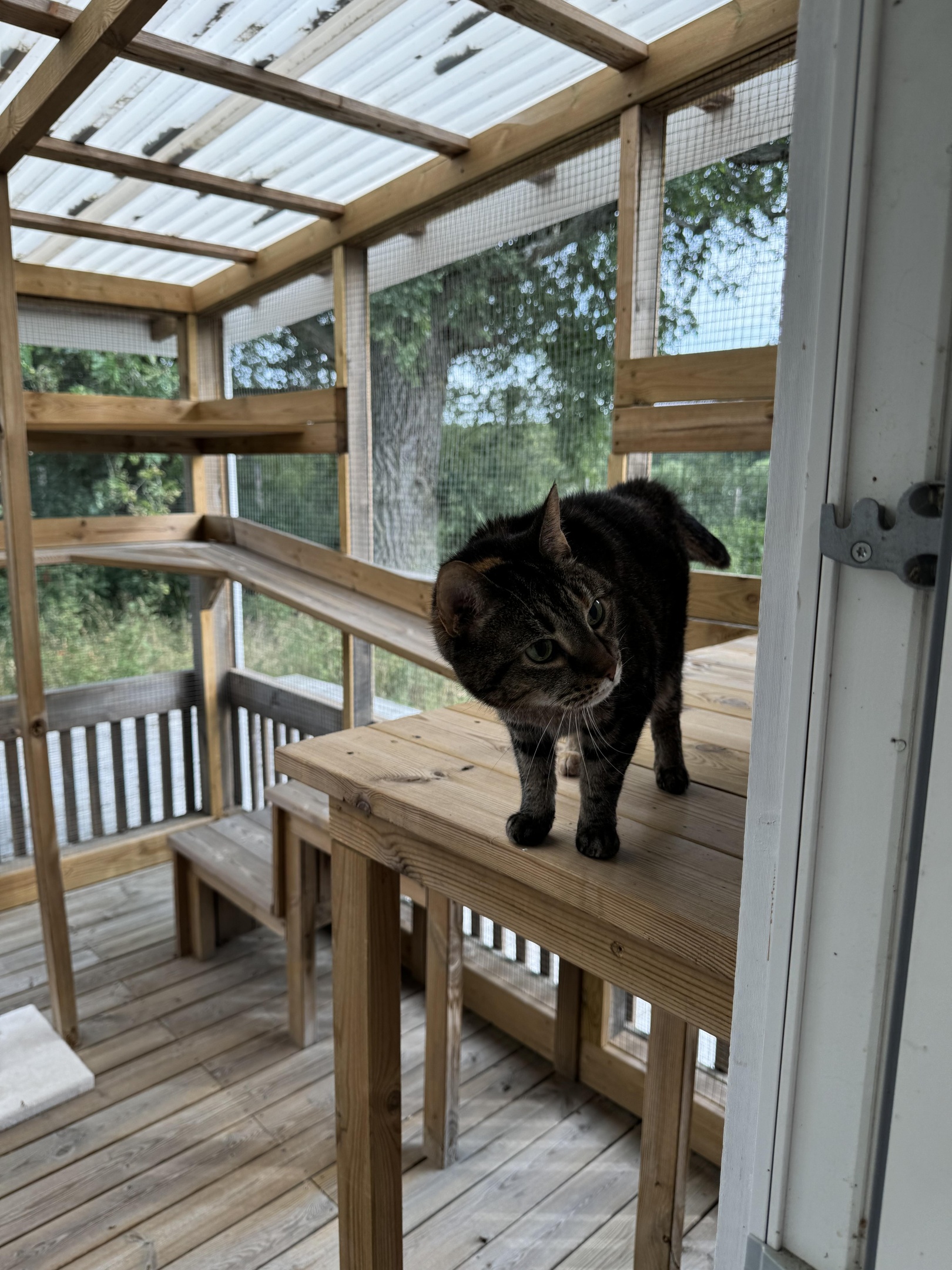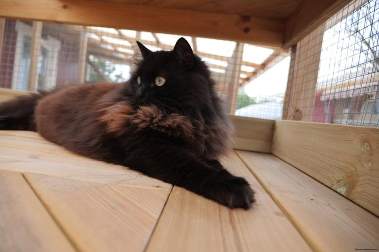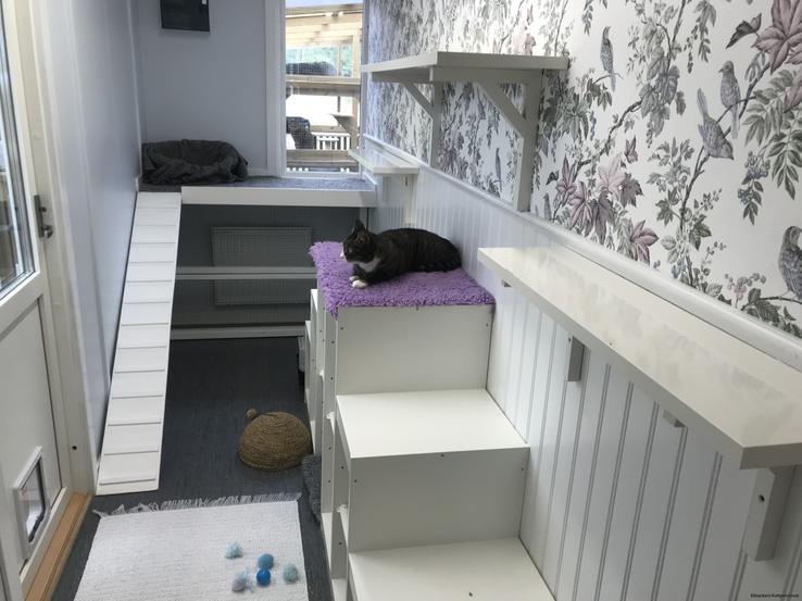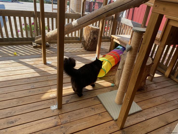 Uteplatserna har spännande fasta ramper och hyllor. Under sommaren är altandörrarna uppställda på vid gavel, och katterna kan gå in och ut som dom vill. Katthuset och uteplatserna har videoövervakning.