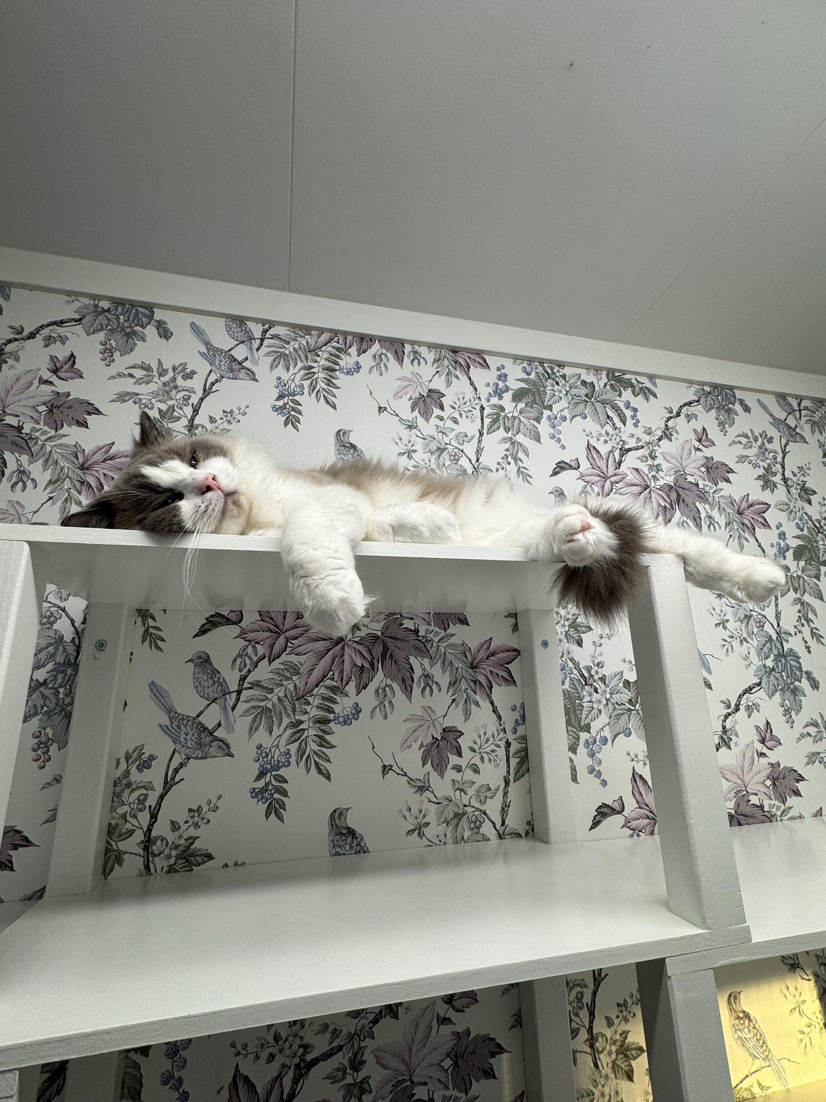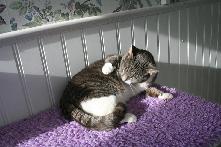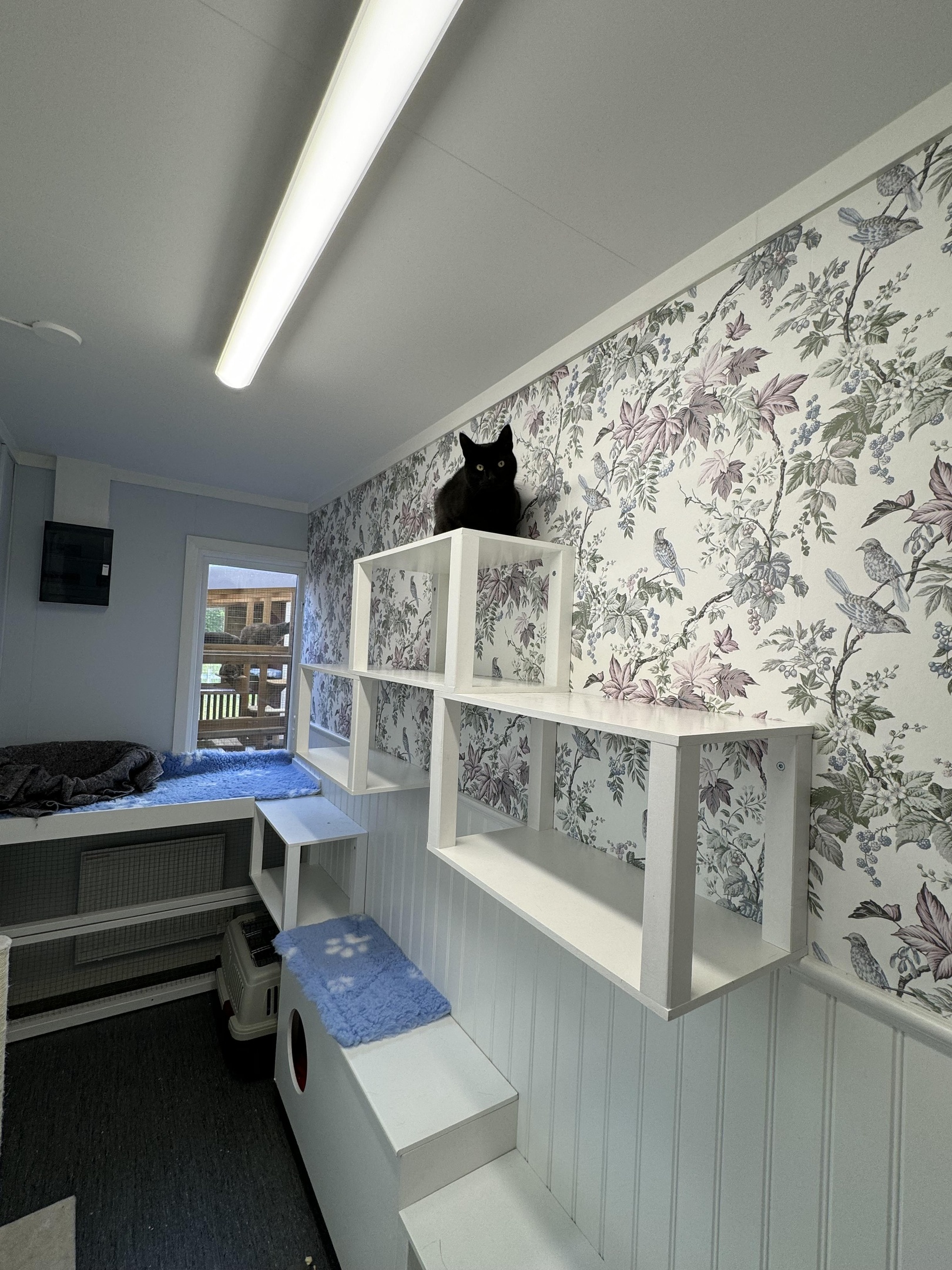Rummen har stora fönsterbänkar, vägghyllor, ramper och klöspelare. På dagen har vi radion på svag volym - vi brukar oftast spela Lugna favoriter.